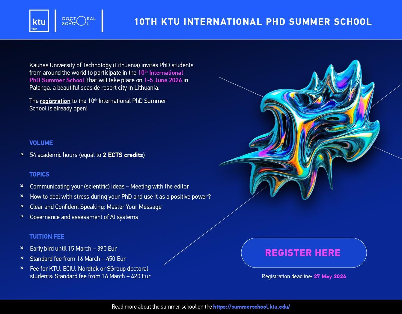 Kaunas University of Technology (KTU) invites PhD students from around the world to participate in the 10th International KTU PhD Summer School, taking place 1–5 June 2026 in Palanga, Lithuania.